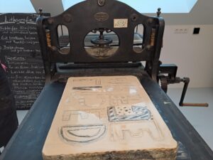 Nun rollte die Museums-Mitarbeiterin mit einer Farbwalze über den Stein. Anschließend legten wir ein Papier gerade auf den Stein. Danach legten wir noch eine Schutzfolie auf das Papier. Wir zogen einen sehr schweren Hebel runter und kurbelten an einer Kurbel, so dass der Stein sich bewegte. Ein schwerer Balken drückte nun doll auf die Schutzfolie, so dass der Stein das Papier bedruckt. Es war ein sehr schöner Ausflug.